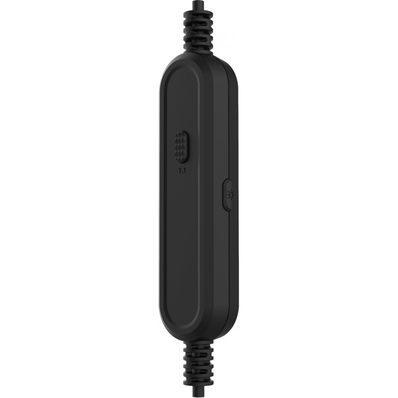 Зручний пульт керування на шнурі дозволяє легко регулювати гучність, а також вмикати й вимикати мікрофон, режим віртуального об'ємного звучання й підсвічування гарнітури.