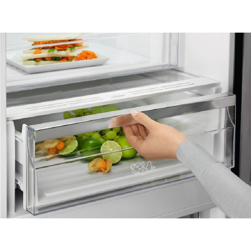 Розумне подвійне охолодження TwinTech No Frost захистить продукти від втрати вологи. Роздільне охолодження холодильної та морозильної камер перевершує стандартні системи No Frost. Забудьте про лід в морозильній камері! З TwinTech No Frost продукти в холодильній камері «усихатимуть» на 60% менше.