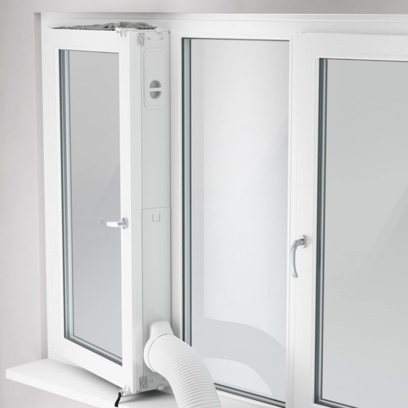 З високорегульованими телескопічними ущільнювальними пластинами, тканинними панелями та висувними затискачами віконний комплект призначений для встановлення бічних петель різної ширини та висоти. Сумісний з будь-яким портативним кондиціонером, який використовує шланг діаметром 15 см.