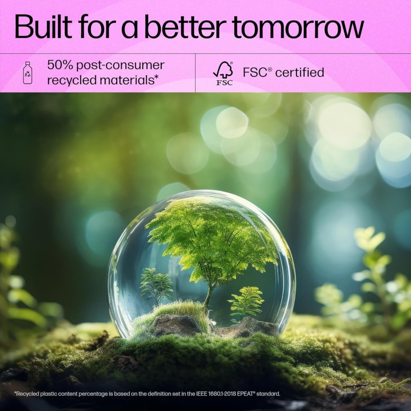 Клавіатура працює від двох батарейок AAA, забезпечуючи до 24 місяців автономної роботи. Виготовлена з 50% переробленого пластику та постачається в екологічній упаковці, що підкреслює відповідальність HP перед навколишнім середовищем.