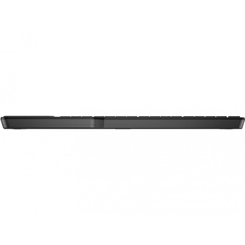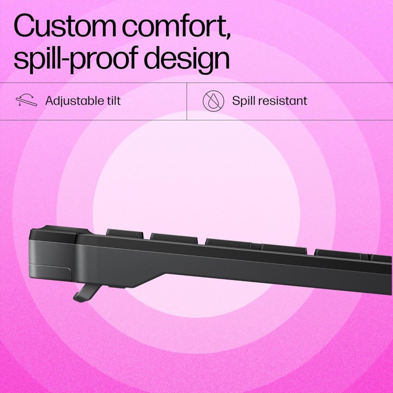 Клавіатура має повнорозмірну розкладку з цифровим блоком, низькопрофільними клавішами з ходом 2,5 мм та спеціальними кнопками для вимкнення мікрофона, емодзі та зміни мови. Вона також підтримує програмування до 12 функціональних клавіш через програму HP Accessory Center.