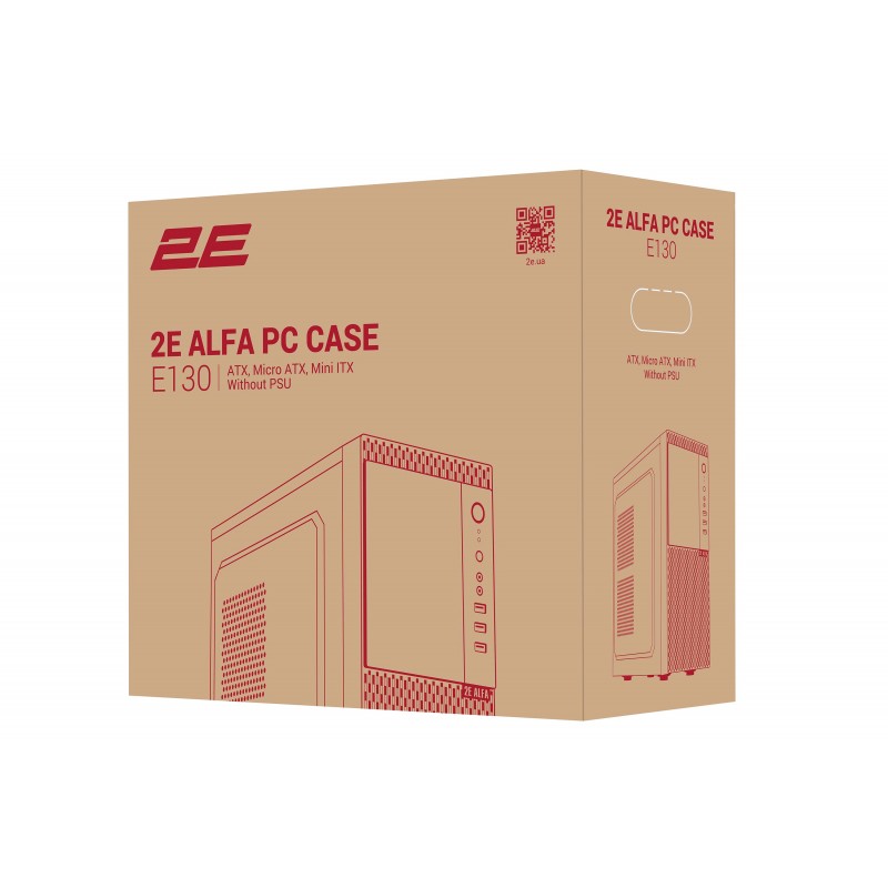 Корпус має оптимальний набір стандартних рознімів для підключення різноманітних зовнішніх пристроїв: 2 × USB 2.0, 1 × USB 3.0, HD AUDIO+MIC, а також усі необхідні кнопки та індикатори: Power, Reset, Power LED, HDD LED. У комплекті 2E ALFA (2E-E130) крім вбудованого на задню панель вентилятора 80 мм є також блок живлення 400 Вт (верхнє розташування) із кабелем живлення, інструкція та набір кріпильних елементів.
