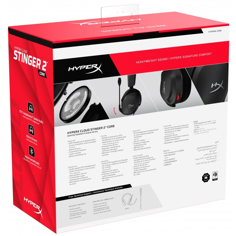 Регульовані повзунки і м'які амбушюри забезпечують комфорт, гнучкий мікрофон, що відключається поворотом, який завжди можна розмістити з максимальною зручністю, регулятор гучності - все це робить гарнітуру виключно простотою у використанні і мінімально відволікає в напружені моменти гри. У комплекті з гарнітурою постачається дворічна підписка на DTS Headphone:X Spatial Audio — технологію віртуального тривимірного звучання, що підтримує точне позиціонування джерел звуку не тільки слухача, але й по висоті. Гарнітура HyperX Cloud Stinger 2 Core сумісна з ПК та безліччю ігрових платформ, забезпечена дворічною гарантією та безкоштовною технічною підтримкою.