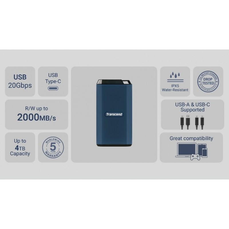Transcend ESD410C – це сучасне рішення для тих, хто цінує високу швидкість роботи, надійність зберігання інформації та зручність користування.