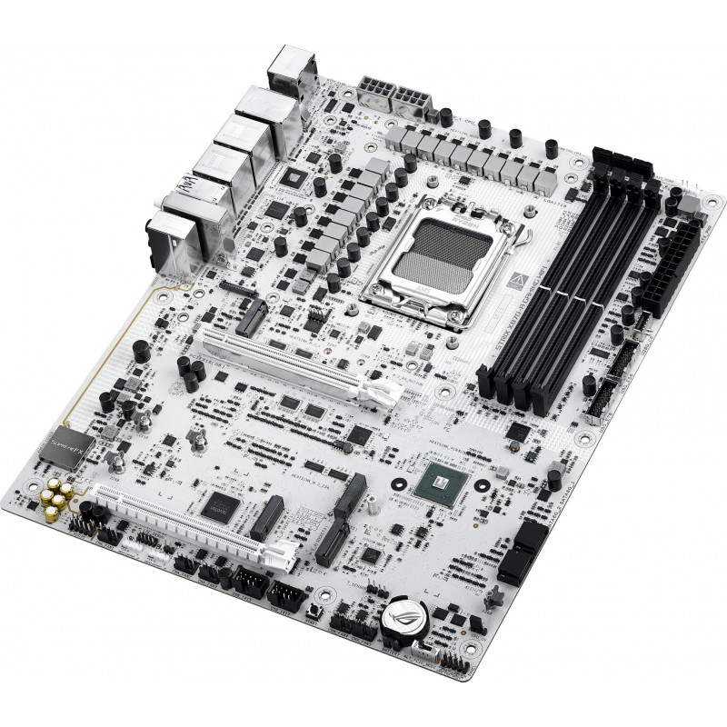 ROG Strix X870-A виділяється своєю вражаючою білою друкованою платою, пропонуючи свіжий і сучасний естетичний вигляд, який бездоганно доповнює практично будь-яку збірку системи. Металеві радіатори в тон підкреслюють її чистий і чіткий вигляд, а ледь помітне RGB-підсвічування на панелі вводу/виводу дає змогу зберегти витончений, стриманий зовнішній вигляд або продемонструвати сміливий, яскравий дизайн.