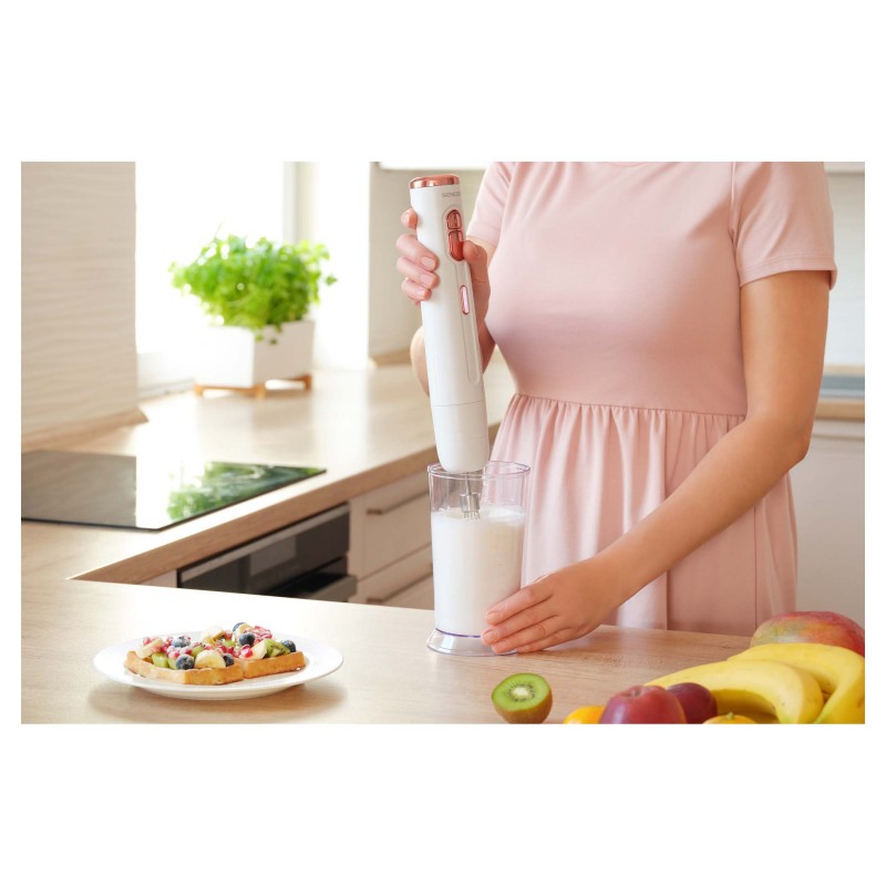 Блендер оснащений високоякісним віночком з нержавіючої сталі для виготовлення ідеально гладких і пухких кремів, спредів і легкого тіста. Ще одна насадка з нержавіючої сталі - паличка, яка підходить для приготування різних закусок і для змішування крем-супів.