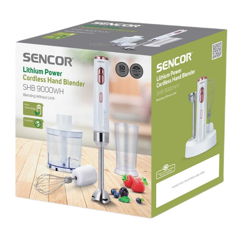 Ручний блендер Sencor SHB9000WH має вбудований літій-іонний акумулятор високої ємності на 2000 мАг, який гарантує потужну бездротову роботу. З цим блендером ви можете буквально танцювати по кухні, і ніщо не буде заважати вашим рухам. На корпусі міксера є світлодіодний індикатор, який показує рівень заряду акумулятора. За допомогою функції Direct Drive ви можете заряджати пристрій і продовжувати ним користуватися.