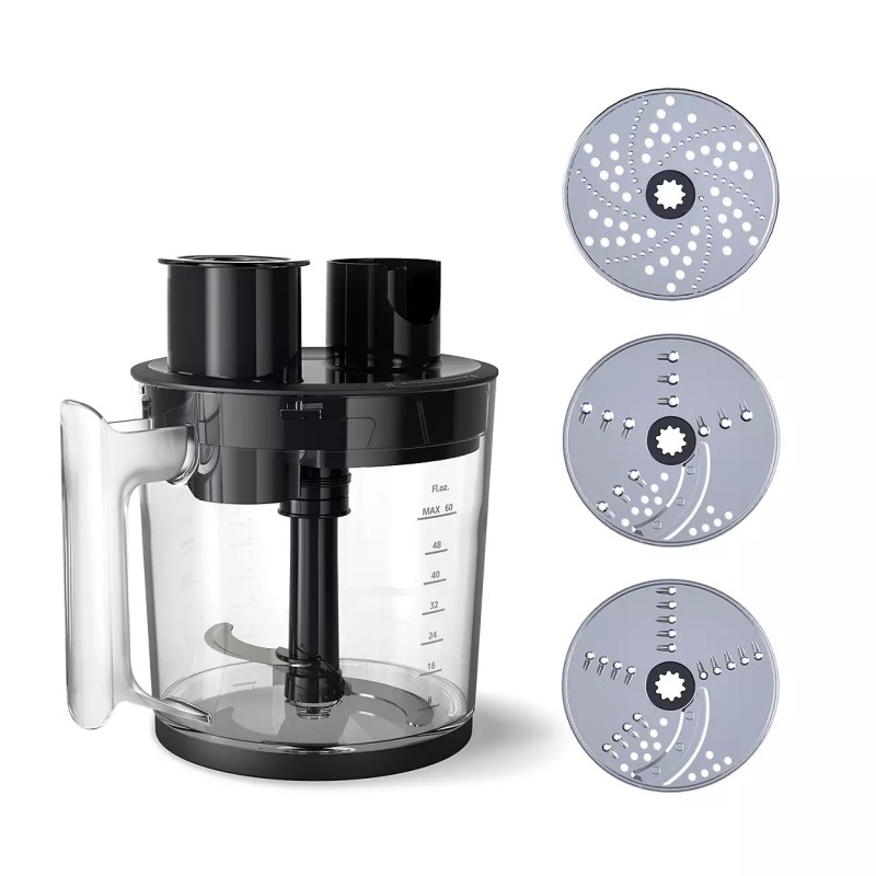 Харчовий процесор високої ємності об'ємом 1,7 літра ідеально підходить для великої родини. В комплект входить S-подібне лезо для подрібнення великих порцій їжі та три додаткові диски, які дозволяють нарізати продукти товстими або тонкими скибками, шаткувати товстими або тонкими смужками, а також гранулювати (ідеально для картопляного пюре або сиру).
