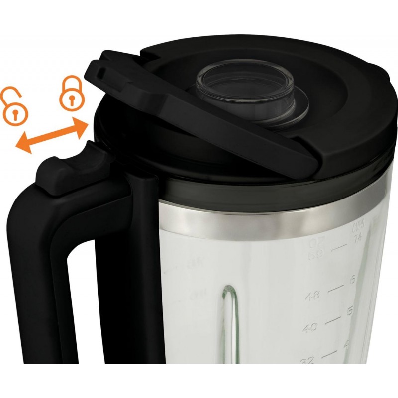 Запобіжний блокувальний механізм гарантує, що блендер не ввімкнеться, коли користувач до цього не готовий. Блендер працює тільки коли чашу належним чином установлено й зафіксовано на базі. Завдяки спеціальній технології безпеки на кришці продуктивність приладу дійсно висока, а робота — безпечна.