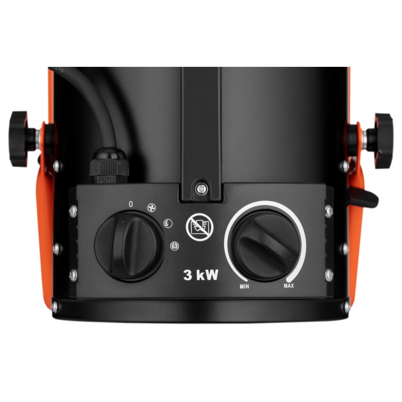 Теплова гармата 2E-AHT3000 має корпус сучасної циліндричної форми. Надійна та довговічна конструкція виготовлена з металу, має порошкове покриття від корозії та іржі. ПІДЗАГОЛОВОК: Ефективна та регульована Нагрівається гармата 2E-AHT3000 майже миттєво завдяки нагрівальному елементу з нержавіючої сталі потужністю 3кВт, якої достатньо для обігріву приміщення площею 30 м2. Потужність можна регулювати – наявний вбудований термостат.