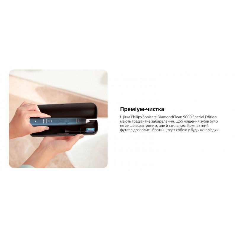 Щітка DiamondClean 9000 має чудовий ергономічний дизайн з ефектом деграде й забезпечує першокласне чищення відповідно до бажань. Тонкий компактний дорожній кейс відповідного кольору дозволить вам брати пристрій куди завгодно.