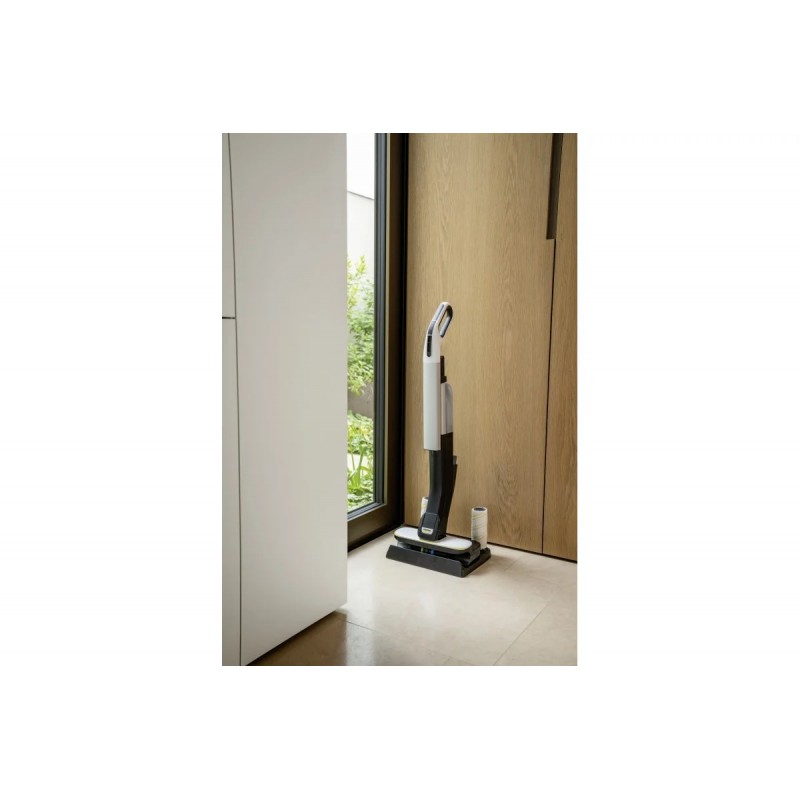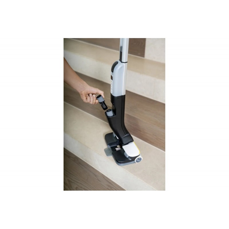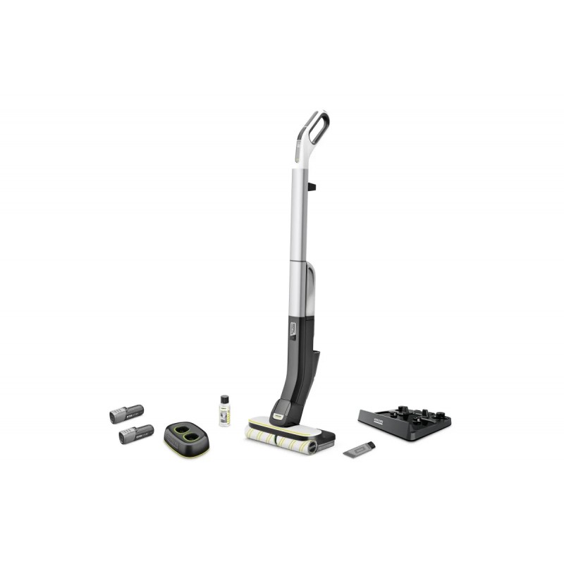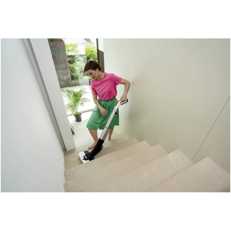 Апарат для вологого прибирання підлоги FC 4-4 дає змогу відмовитися від попереднього прибирання пилососом і в один сеанс видаляти як сухі, так і вологі забруднення. Завдяки тривалій роботі від одного заряду акумулятора (до 30 хвилин) з його допомогою можна без великих зусиль очистити підлоги площею до 90 кв. м. Швидкозарядний пристрій Duo, що входить до комплекту, заряджає акумулятор лише за 70 хвилин. У ньому передбачена оптична сигналізація закінчення чистої води й заповнення бачка для брудної води. Після ввімкнення апарата обидві його роликові щітки автоматично постійно зволожуються водою з бачка для чистої води, причому її витрату можна змінювати залежно від виду підлогового покриття, обираючи один із двох режимів прибирання. Він очищає навіть важкодоступні місця і без проблем збирає з підлоги волосся. Вбудований бачок для брудної води запобігає безпосередньому контакту з брудом. Після закінчення прибирання його можна легко зняти й очистити. Пилосос стійко стоїть у вертикальному положенні та завдяки знімній ручці займає мало місця при зберіганні. Він підходить для прибирання будь-яких твердих підлогових покриттів.