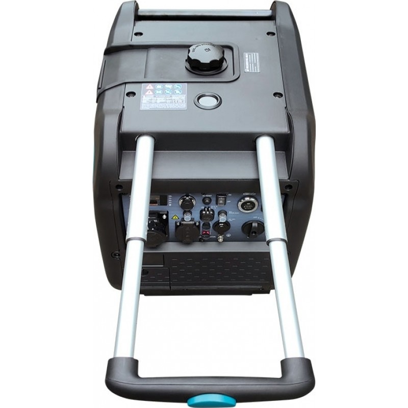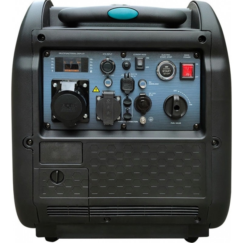 Зручне розташування усіх функцій: багатофункційний LED-дисплей (лічильник мотогодин, вольтаж, частота), індикатори контролю стану генераторної установки, що сигналізують про робочий стан, спрацювання автомату захисту при перевантаженні або короткому замиканні, про низький рівень оливи, кнопка Reset для перезавантаження системи контролю та відновлення подачі напруги, роз’єм для паралельного підключення генераторів, два USB-виходи (5B/1A, 5B/2.1A), розетка 230В та клема заземлення.