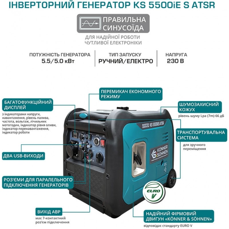 Вбудований електронний блок з мікропроцесорним керуванням контролює роботу генератора та забезпечує стабільну вихідну напругу 230В 50 Гц синусоїдальної форми, що підходить для надійної роботи чутливої електроніки.