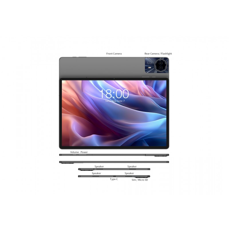 Teclast T65 Max має тонкий корпус з алюмінієвого сплаву товщиною всього 7.8 мм, що робить його легким та зручним у використанні. Піскоструминна обробка поверхні додає пристрою елегантного вигляду та стійкості до відбитків пальців.