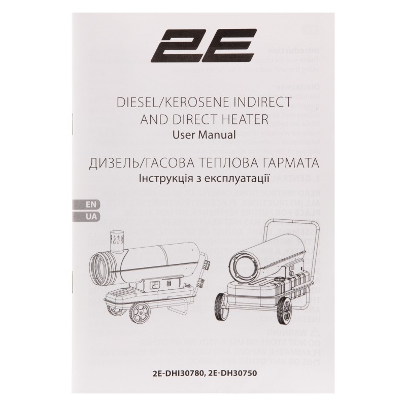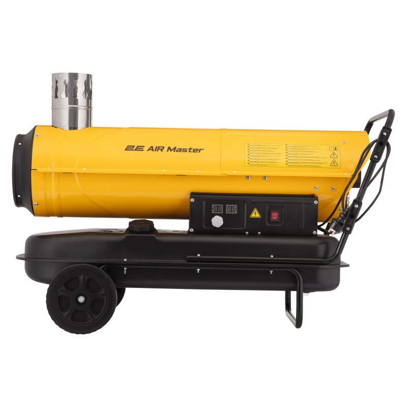 Дизельна теплова гармата непрямого нагріву 2E потужністю 30 кВт має міцну металеву конструкцію з колесами та оснащена баком ємністю 56 літрів. Може працювати на дизельному паливі та гасі. Передні колеса дозволяють вільно переміщувати пристрій між приміщеннями та об'єктами. Оснащений датчиком рівня палива. Нагрівач має клас захисту IPX4.