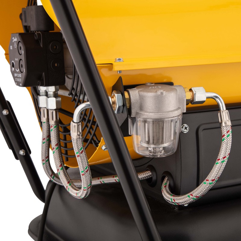 Переносне джерело тепла, теплова гармата, має термостат із зручним вимикачем контролю температури, а також датчик полум'я, що відключає подачу живлення у разі нестачі масла та світловий індикатор несправності, що впливає на безпеку користувачів.