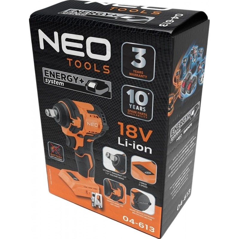 Цей ударний гайковерт є частиною серії Energy+ від NEO Tools, що означає сумісність з іншими інструментами та акумуляторами цієї лінійки. Відсутність акумулятора та зарядного пристрою в комплекті дозволяє користувачам, які вже мають інструменти цієї серії, заощадити на придбанні додаткових батарей. Завдяки поєднанню потужності, надійності та зручності використання, NEO Tools 04-613 стане незамінним помічником у виконанні різноманітних завдань, пов'язаних із загвинчуванням та відгвинчуванням кріплень.