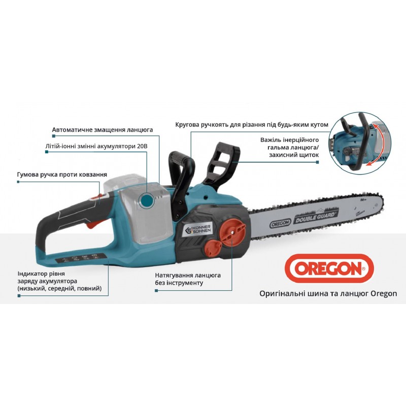 Акумуляторна ланцюгова пила працює на двох акумуляторах 20В, забезпечує тривалу роботу без підзарядки, немає обмежень дроту та привʼязки до розеток.