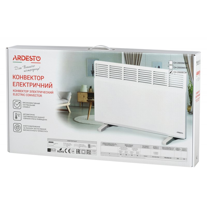 Ardesto СН-2000ECW використовує надійні комплектуючі – закритий обребрений нагрівальний елемент німецької компанії Eihenauer, а також італійський високоточний біметалічний термостат. Відсутність рухомих компонентів і продумана конструкція повністю виключає будь-які шуми при роботі.